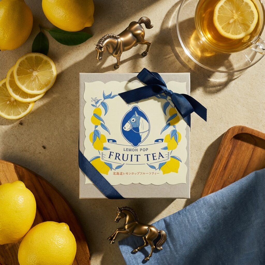サラブレッド「レモンポップ」をモチーフにしたフルーツティーのパッケージデザインを担当しました。